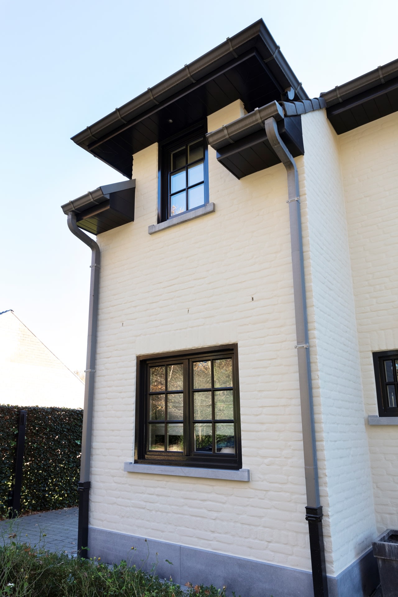 Binnen schilderen we ramen, deuren, deurlijsten of plinten al langer in dezelfde tint als de wanden. Dit brengt rust en oogt strak. In deze realisatie zie je dat je ook buiten perfect voor deze werkwijze kan kiezen. Het gevelvlak, de gecementeerde boord én de ramen kregen dezelfde stijlvolle, donkerdere kleur. Wist je trouwens dat er ook erg mooie matte lakken bestaan voor buitenschrijnwerk? Deze zorgen voor een hedendaagse en tijdloze look.